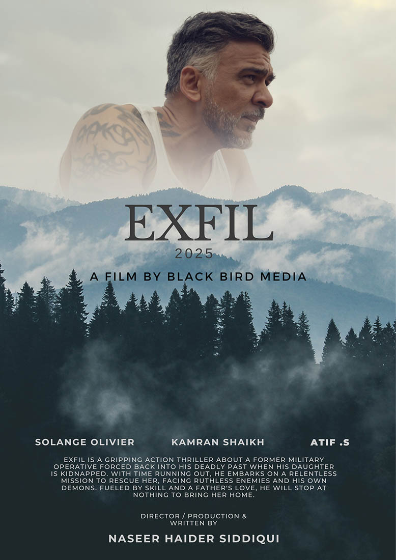 Exfil 2025 is a high-octane action thriller short film written, directed, produced, and edited by Naseer Haider Siddiqui, brought to life through cinematic visuals, intense tactical sequences, and a deeply emotional story. The film follows an ex-military special operations veteran who must confront his past and return to the battlefield to save his kidnapped daughter — no matter the cost. IMDb+1